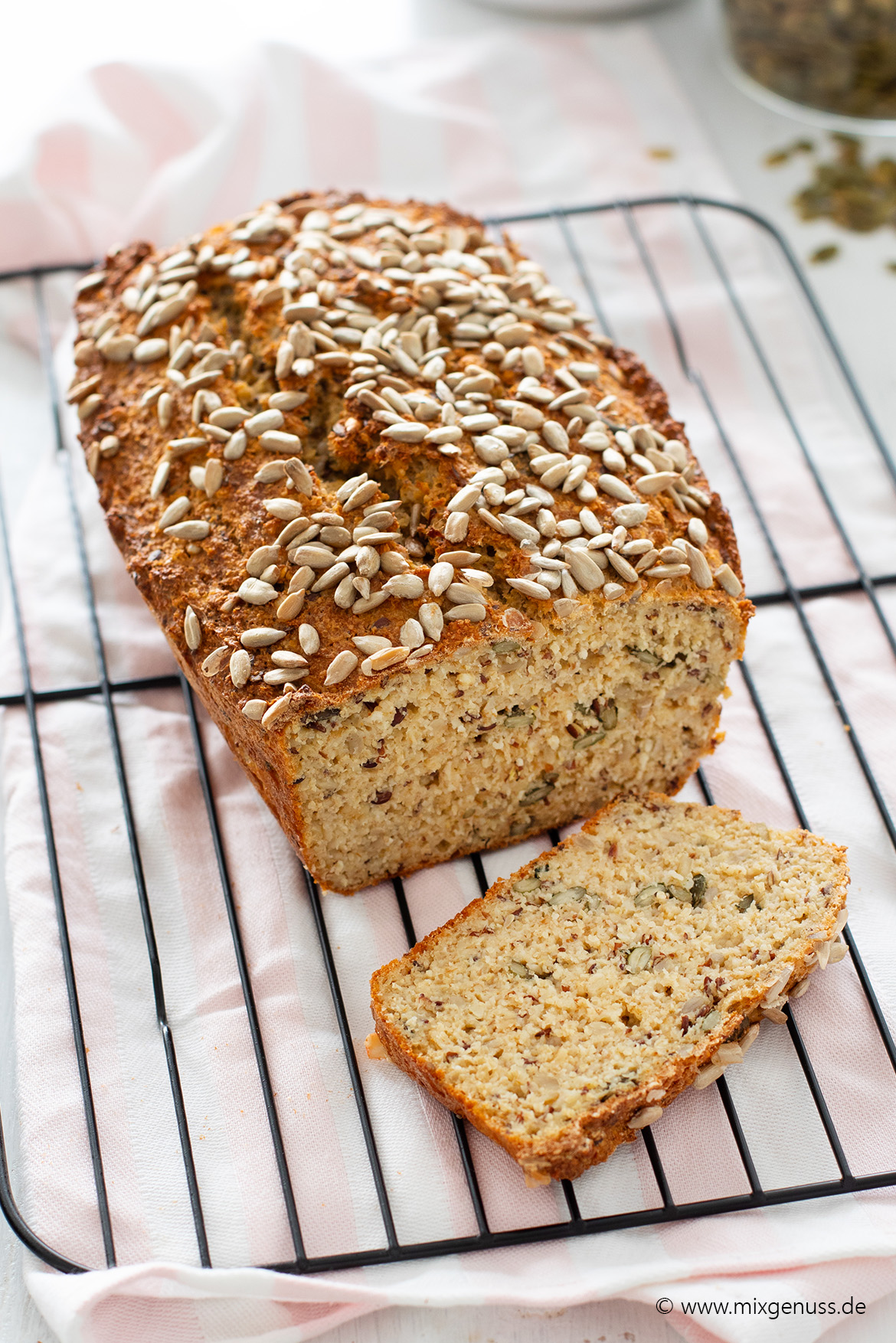 - Alle Zutaten zu einem Teig verrühren und in eine gefettete 20 cm Kastenform füllen. Mit Sonnenblumenkerne bestreuen.