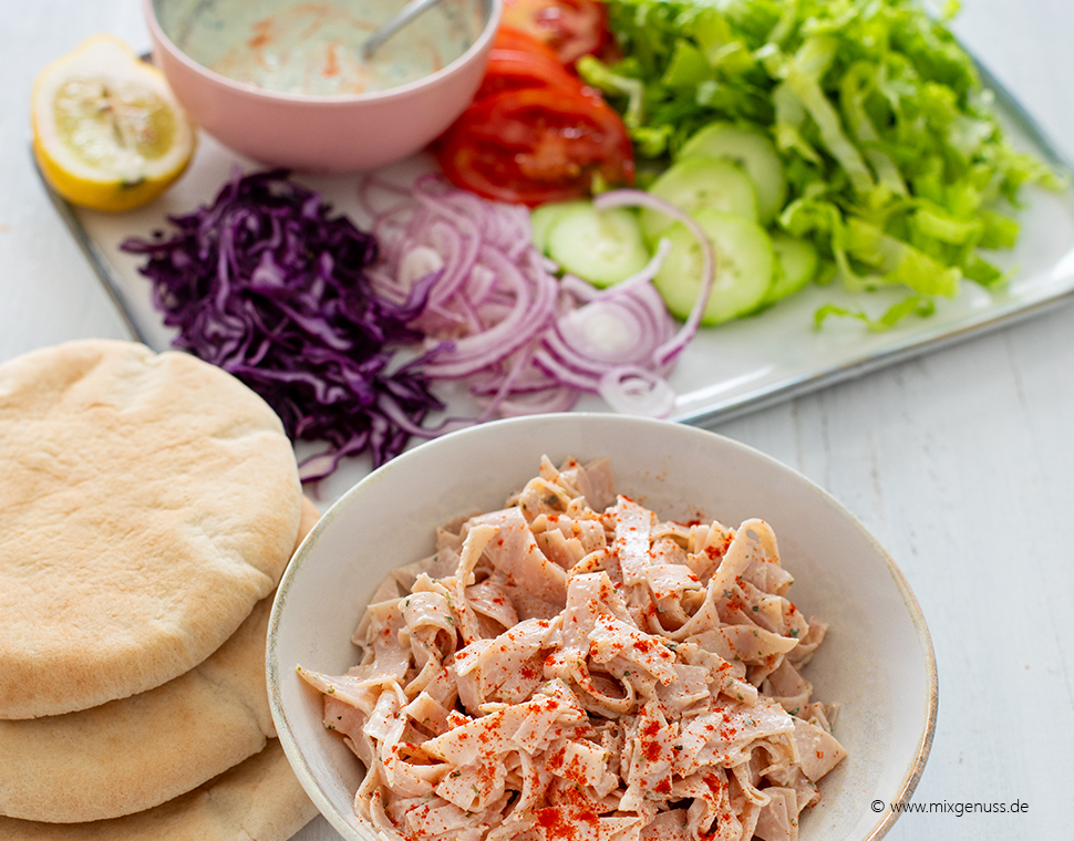 1. Den Hähnchenbrustaufschnitt in Streifen schneiden und mit Joghurt, Olivenöl und Gewürzen vermengen. Nach Wunsch kurz ziehen lassen. Mit etwas Öl in einer Pfanne anbraten.