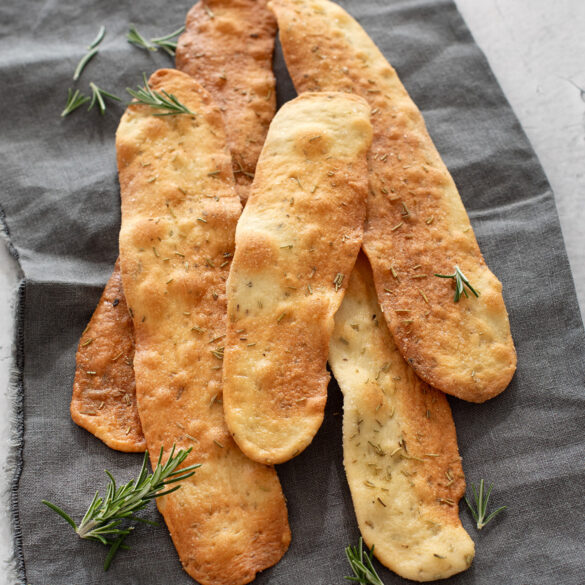 Die dünnen Teigzungen auf ein Backblech mit Backpapier legen und mit Öl bepinseln. Je nach Wunsch mit Kräutern oder Knoblauch und grobem Meersalz bestreuen. Im vorgeheizten Backofen bei 180°C Umluft ca. 12 Min. knusprig backen.