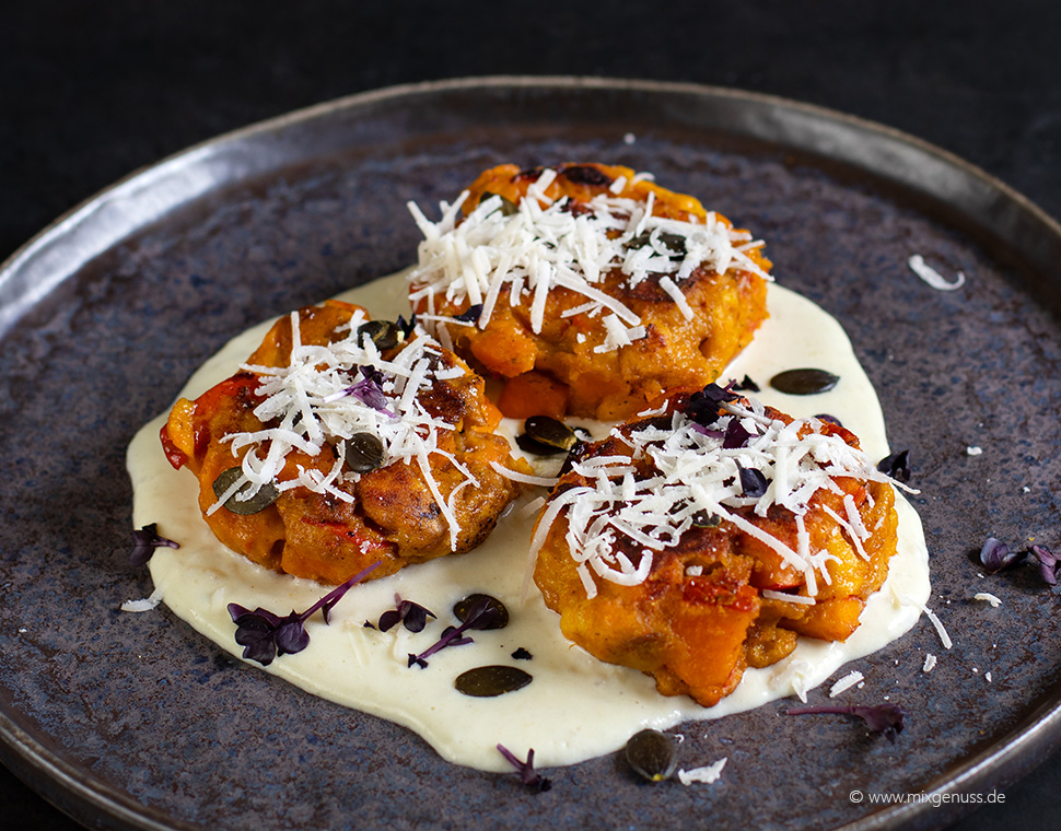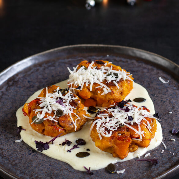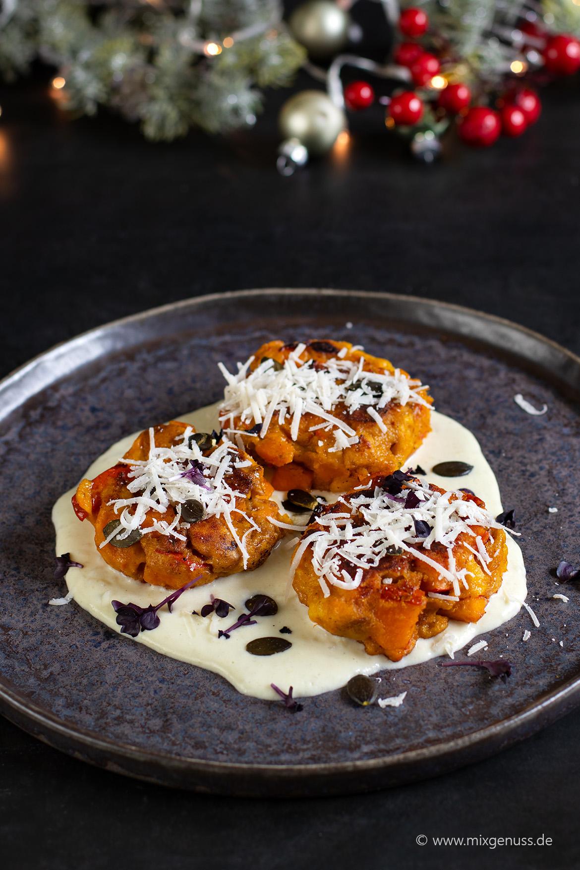 Wow, wie schnell die Zeit vergeht! Nur noch 4 Tage, dann ist schon Weihnachten. Heute haben wir ein deftiges Soulfood-Rezept für Euch: Kaspressknödel – und zwar eine super leckere Variante mit Kürbis! Dazu wird eine cremige Sauce mit Frischkäse serviert. Bestreut mit geriebenem Parmesan, Kürbiskernen und Kresse ist dieses Gericht ein absolutes Highlight im Weihnachtsmenü! Wer möchte, kann dazu einen grünen Salat servieren.
