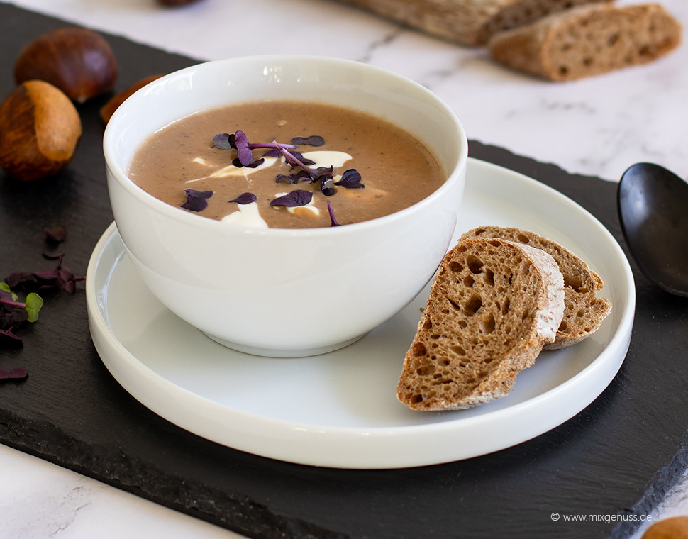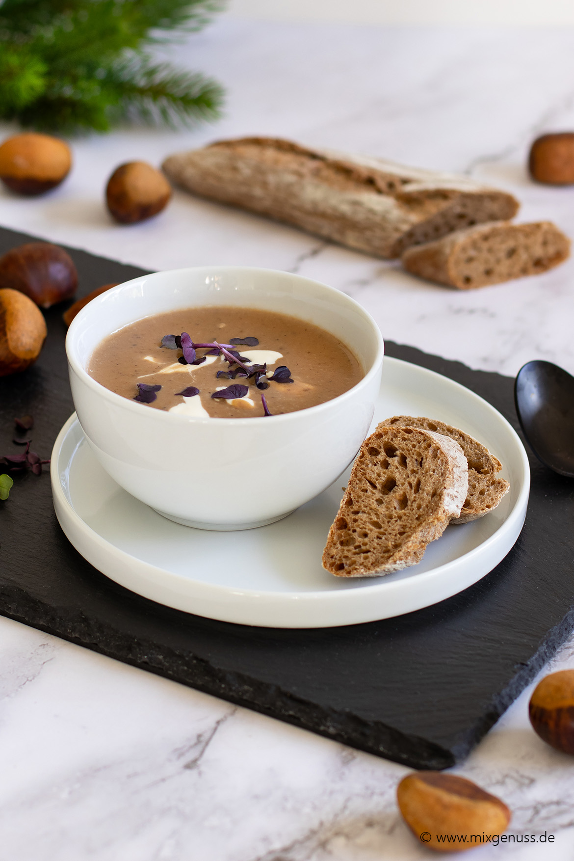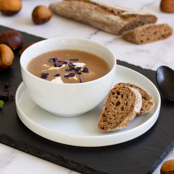 Hinter Türchen Nr. 18 unseres digitalen Adventskalenders versteckt sich noch ein super einfaches Rezept für den Winter: Cremige Maronensuppe einfach im Thermomix gekocht. Auch eine leckere Vorspeise für das Weihnachtsmenü, aber vorsicht, am besten kleine Portionen servieren, da die Suppe sehr sättigend ist. Auch als schnelles Abendessen mit einem rustikalen Baguette perfekt! Ein gelingsicheres Rezept für ein Roggen-Baguette, was hervorragend zur Suppe passt, könnt Ihr ebenfalls auf unserem Blog finden.
