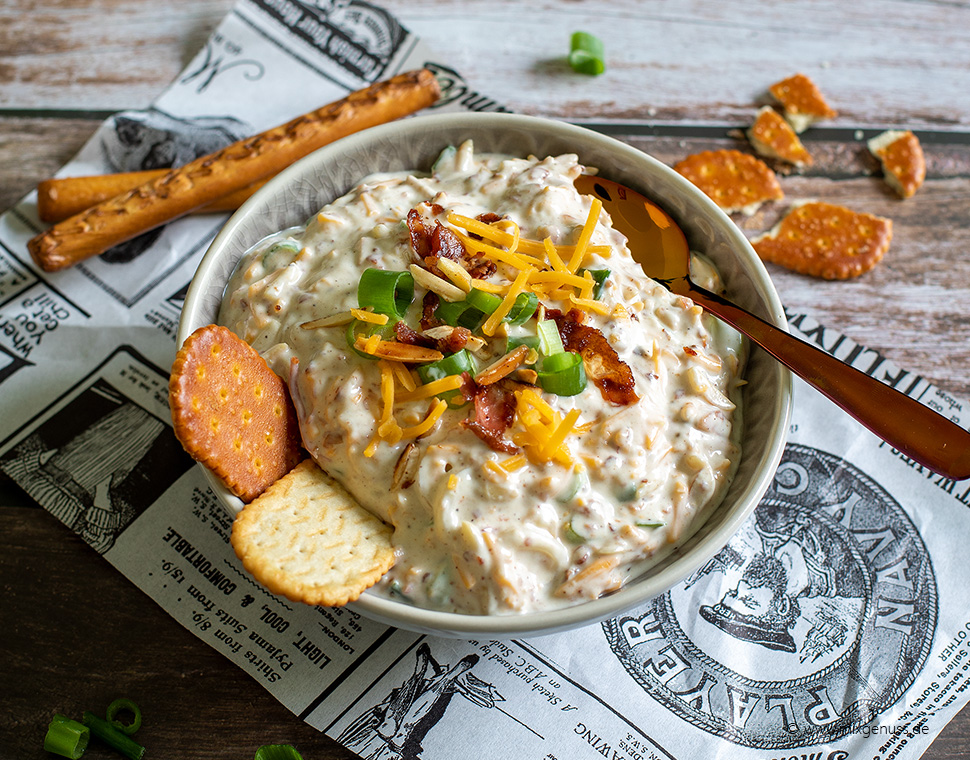 Gestern haben wir Euch ja schon ein paar Rezeptideen für Silvester gezeigt und heute geht’s weiter. Wir haben den perfekten Partydip für Euch! Den Million Dollar Dip mit knusprigen Bacon, Cheddar und gerösteten Mandeln müsst ihr unbedingt ausprobieren. Super zum Dippen mit Crackern oder Salzgebäck. Für eine vegetarische Variante des Dips den Bacon einfach durch Paprika ersetzen. Weitere Rezepte für leckere Dips findet Ihr in unserer MixGenuss App in der digitalen Rezeptsammlung „Dip Dip Hurra!“.