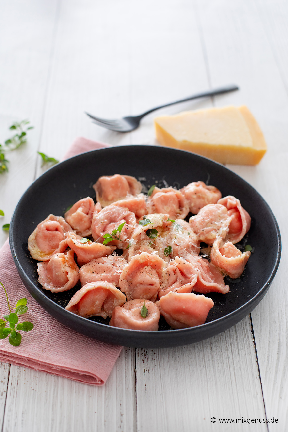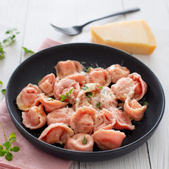 An Valentinstag müssen es nicht immer süße Rezepte sein, mit denen Ihr Eure Liebsten überrascht. Auch mit diesen selbstgemachten rosa Tortellini zaubert Ihr garantiert jemanden ein Lächeln ins Gesicht. Unsere rosafarbenen Valentinstags-Tortellini werden aus einem selbstgemachten Pastateig mit Rote-Bete-Saft zubereitet und erhalten dadurch die besondere Farbe. Gefüllt wird die selbstgemachte Pasta mit einer cremigen Ricotta-Zitronen-Parmesan-Mischung. Nach dem Formen werden die Tortellini kurz gekocht und anschließend in Butter geschwenkt. Wer möchte kann auch eine Pastasauce dazu servieren, unser Tipp die Sauce Parmigiano aus unserem Buch Pastasaucen.