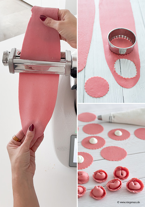 - Aus dem Teig runde Kreise (ca. 4–5 cm) ausstechen und je 1 TL Füllung in die Mitte geben. Wir empfehlen euch hierfür einen Spritzbeutel mit Lochtülle zu verwenden, so kommt die Füllung schnell und sauber auf den Nudelteig. Teigstücke zu einem Halbkreis falten und Ränder festdrücken. Dann die Teigspitzen aufeinanderlegen (Tortellini-Form).