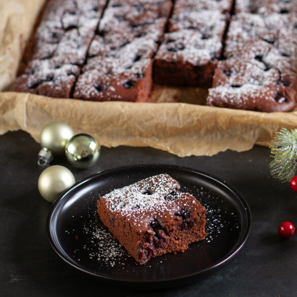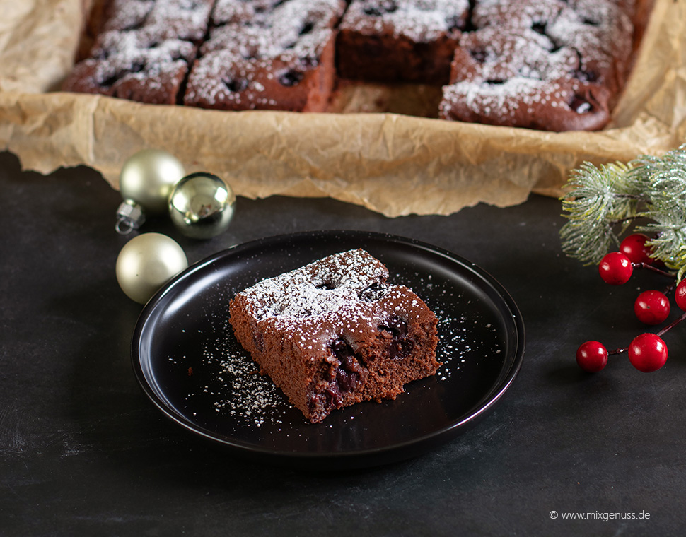 Mit diesem schokoladigen Blechkuchen-Rezept verkürzen wir Euch die Wartezeit bis zum Fest. Dieser Schoko-Kirsch-Kuchen ist super saftig und die Zubereitung ist wie immer schnell und einfach. Alle Zutaten werden nacheinander im Theromix vermengt, bis auf die Kirschen, die werden zum Schluss auf dem Teig verteilt. Nach dem Backen könnt Ihr den Schoko-Kirsch-Kuchen noch mit etwas Puderzucker bestäuben und genießen.