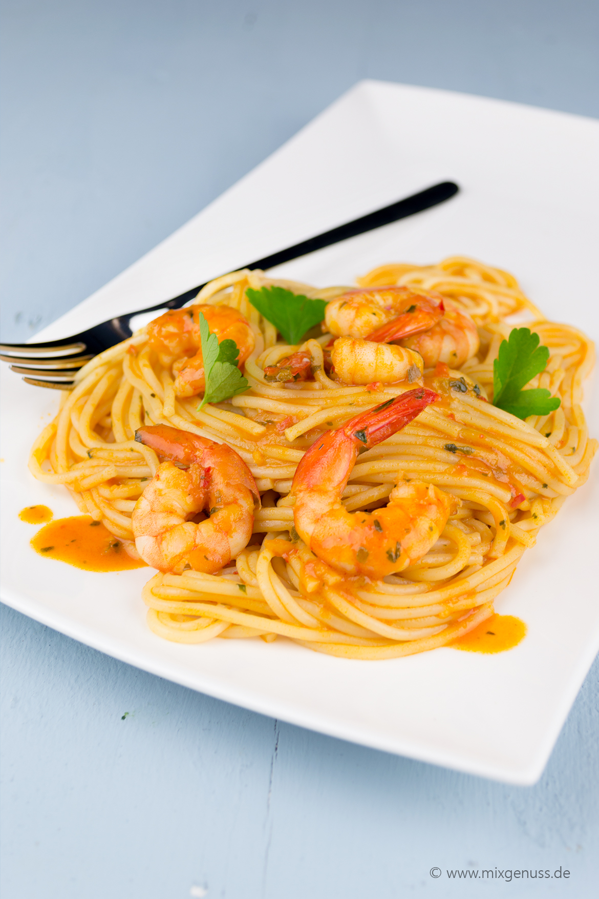- Scampi in einer heißen Pfanne mit Olivenöl anbraten. Sauce aus dem Mixtopf zugeben und nochmal kurz aufkochen lassen. Spaghetti mit Garnelen und Sauce servieren.