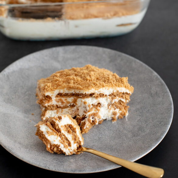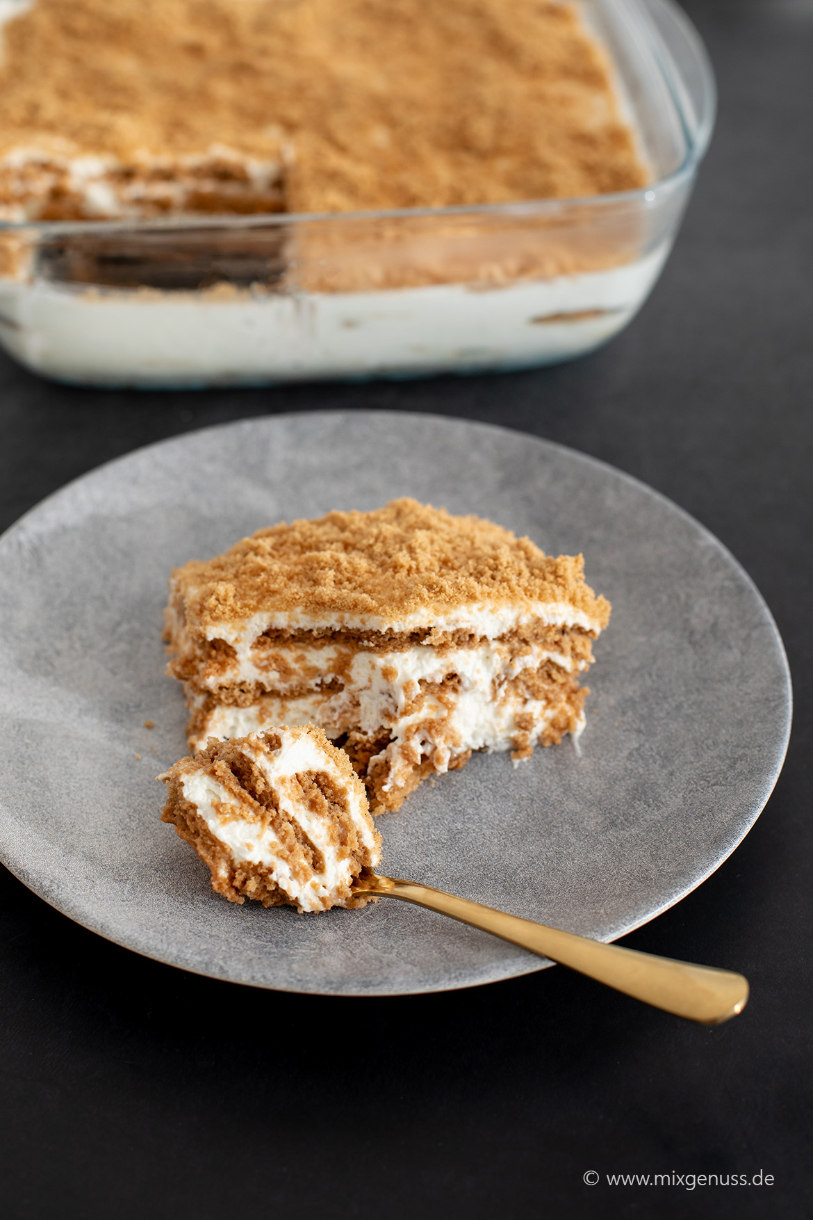 Spekulatiuskekse in Kaffee tränken und eine Auflaufform (20 x 25 cm) damit auslegen. Etwas Creme darauf verteilen und glatt streichen. Vorgang wiederholen bis die Creme aufgebraucht ist. Die letzte Schicht sollte Creme sein.