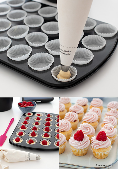 - Teig mithilfe eines Spritzbeutels in die Mulden einer Mini-Muffinform spritzen und jeweils eine Himbeere eindrücken. (Die Mulden am Besten mit Papierförmchen auslegen, alternativ einfetten und mit Mehl ausstreuen). Im vorgeheizten Backofen 15 Min. backen.